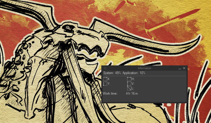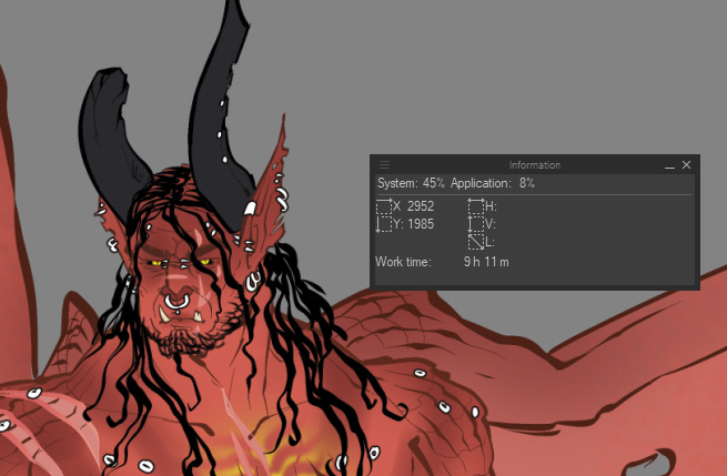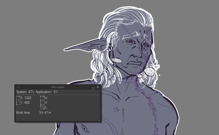 • $25/hr of work, calculated using Clip Studio Paint's built-in timer per canvas.The initial charge of $30 is nonrefundable for any reason. This policy is up to my discretion and will be upheld or excused at any time based on my judgement and any outstanding circumstances regarding the work.Clip studio's work timer will appear as follows. To allow for the most accountability, screenshots will always be provided alongside the current work as pictured: