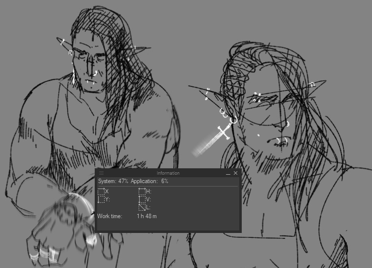 In the case of this specific commission, the sketches are nearly finished. 1 hour and 48 minutes of work was recorded by Clip Studio, which equates to an additional $45 charge at my standard rate of $25/hr. The total charge is $75.