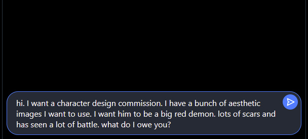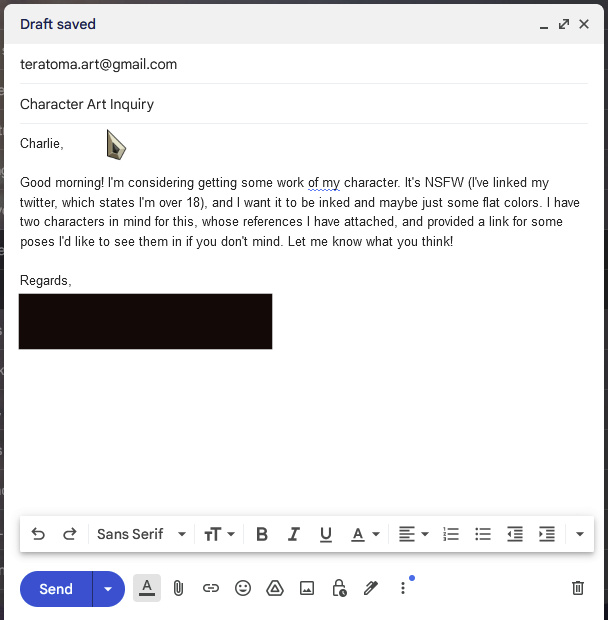 • Until the final payment has cleared, the final image will not be released to the client. Only a compressed thumbnail image will be available.If another payment processor is required for accessibility, and it is within reasonable accommodation for me to apply the use of an alternative platform in order to process your payment, I will do so. Please send me an email at [email protected] or a message on any of my available social medias if this is the case to alert me ahead of time.Images provided to you at any stage of the projects will not be used in the training of AI datasets. My work is never used with the intention of training, being scraped by, nor for formulating prompts in AI datasets. Glazing and Nightshading work is available by request.Understand that this document is a living work and can be changed or altered at any time with or without notice of changes to the client. Please frequently check back and be confident in your understanding of the document to minimize misunderstandings or misinterpretations. If you have any questions, I am always available at [email protected].Acknowledge that the breaking of any clause of these terms and conditions will result in an immediate cease in contact and the client's work will not be completed. If applicable, egregious cases of disregard to the above terms and conditions will result in the client's addition to a blacklist, which will be publicly available upon request.If there are any questions, concerns, of curiosities about the workflow, examples are provided in the link below!